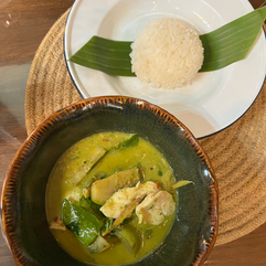 Our third dish was green curry with chicken over rice - Gang Kiew Whan Gai. This was probably my favorite dish that we prepared (although they all were amazing), but it was also the one that I had the most trouble with. 😂 First, I chopped my basil leaves when I shouldn't have (I wasn't paying attention . . . ) - luckily the chef said it would taste the same, no worries. But then I moved my hand slightly when we were using a mortar and pestle to crush chili peppers, briefly exposing the mashed peppers while I worked to crush them - BAD IDEA! Our chef, to his credit, did warn us about this at the start, and I should have really taken that warning to heart. Instead I found myself tapping out of the grinding early and having my partners pick up the slack while I washed my eyes out. 🙈