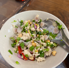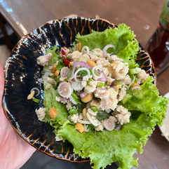 The second dish that we made was a spicy lemongrass salad with chicken - Yum Ta-Krai Gai Sub. It was a no-cooking dish for us because the chicken had already been cooked and minced and was ready to add to our salad. We prepared the salad dressing, which was largely fish sauce, lime juice, and water with some sugar added. Then we combined all of the fresh ingredients and laid our salad on a bed of lettuce.